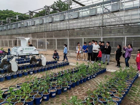 参观活动中,机器人实验室负责人卫佳老师和主要成员分别介绍了自主导航小车、写字机器人和切割机器人等科研成果和最新项目进展;黄成龙老师介绍了自主研发的高通量作物根系自动化测量系统、智能棉花打顶机器人、田间表型智能感知机器人、机械臂三维结构光系统、高精度Micro-CT系统;刘洁老师介绍了柑橘果园的苗钵装填机械、果园开沟机械、农药喷施机械、果枝修剪机械等研究成果。参观学习后,师生们更换装备,在学校东体育馆的羽毛球场进行了热情洋溢的师生羽毛球友谊赛。