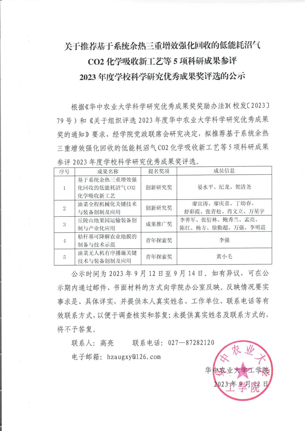 关于推荐基于系统余热三重增效强化回收的低能耗沼气CO2化学吸收新工艺等5项科研成果参评2023年度学校科学研究优秀成果奖评选的公示