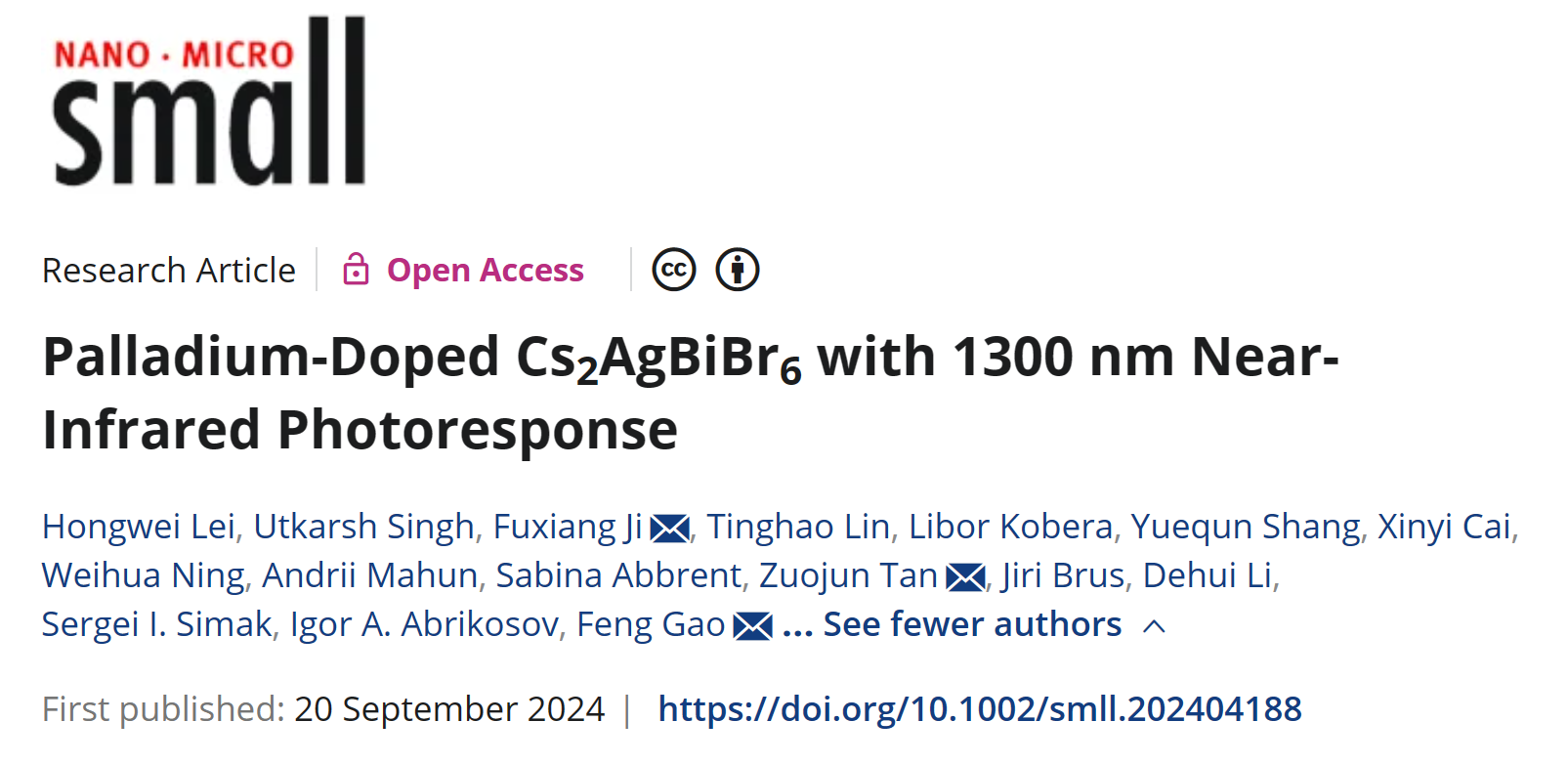光机电共性技术与装备团队研发出一种基于钯(Pd)掺杂的铯银铋溴(Cs₂AgBiBr₆)无铅钙钛矿的红外光电探测器,相关研究成果以“Palladium-Doped Cs2AgBiBr6 with 1300 nm Near-Infrared Photoresponse”为题在Small期刊上在线发表。