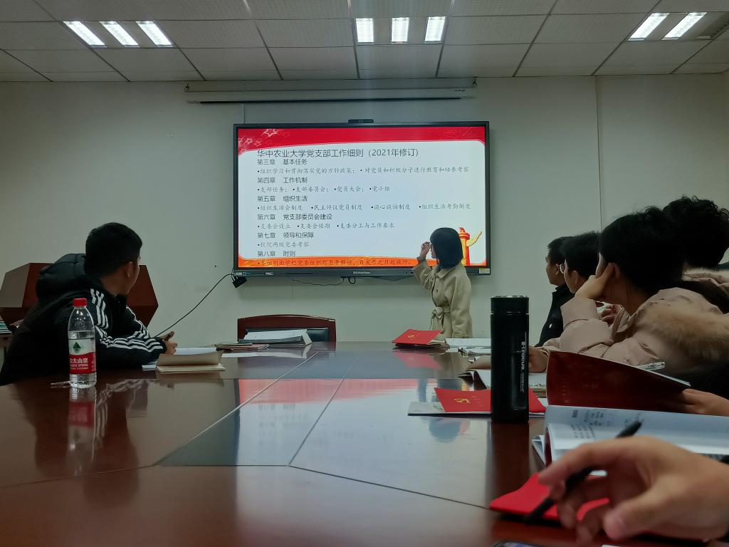 会议伊始,张诗伟同志带领支部成员重温入党誓词。李楚仪同志领学《华中农业大学党支部工作细则(2021年修订)》,她围绕基本任务、工作机制、组织生活、党支部委员会建设、领导和保障及附则进行具体讲解。她提到支部要执行“三会一课”制度、民主评议党员制度、谈心谈话制度并严格执行组织生活考勤制度。