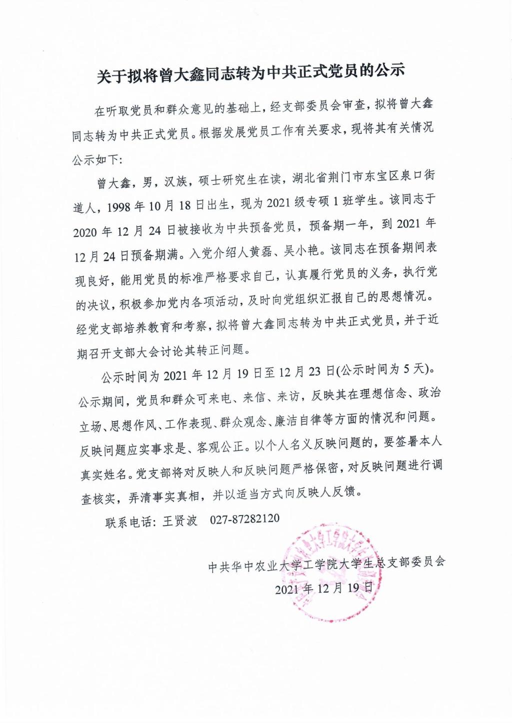 【研】关于拟将曾大鑫同志转为中共正式党员的公示
