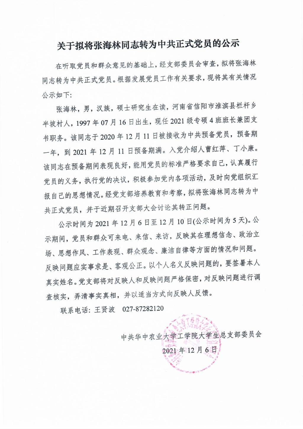 【研】关于拟将张海林同志转为中共正式党员的公示
