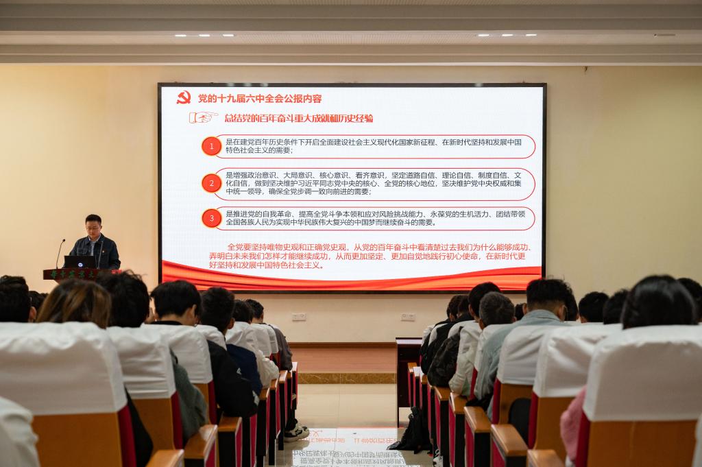 牛彦东首先介绍了党的十九届六中全会的召开背景、召开时间以及参会人员的基本情况,并从大会审议通过的两份重要文件《中共中央关于党的百年奋斗重大成就和历史经验的决议》《关于召开党的第二十次全国代表大会的决议》分析了党的十九届六中全会的主旨要义,以及党的百年奋斗的五大历史意义,向入党积极分子传达了党的十九届六中全会的会议精神,展示党的百年奋斗历程中的十个宝贵历史经验。