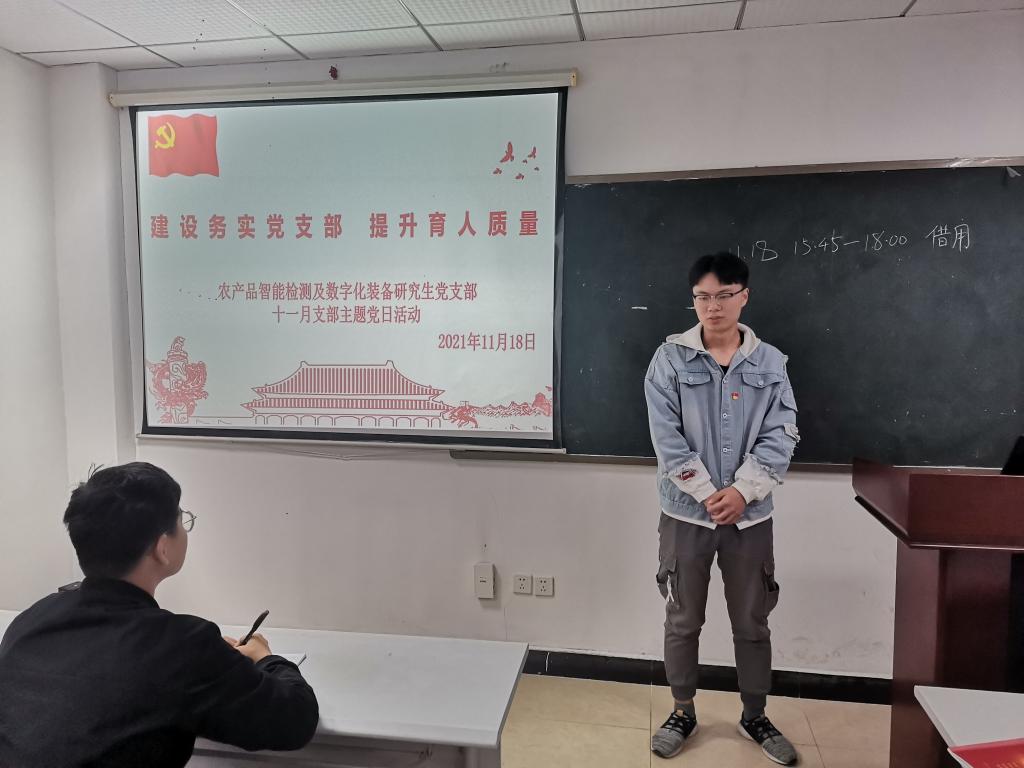 农产品智能检测及数字化装备研究生党支部在工程楼B620会议室开展“建设务实党支部,提升育人质量”主题党日活动。