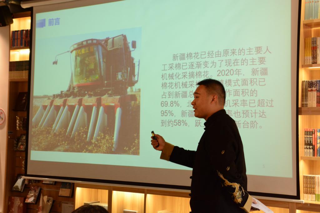 机械2004班陈一铭向大家简介机械在棉花生产中的应用。“今年H&M公司发文抵制新疆棉,说新疆棉花生产存在奴役制度,这一点是毫无根据的,现如今,我国棉花生产已进入全面机械化,早已摆脱人工时代。”陈一铭以H&M事件为例,阐述机械在农耕中的重要应用,并结合相关视频为大家简介棉花机的工作原理,正反结合,列举了一些机器造价昂贵并不能大规模投入使用等,客观陈述了我国棉花机械化进程及所面临的技术问题。听完陈一铭的介绍,大家们都纷纷表示对我国机械化前程充满期待。