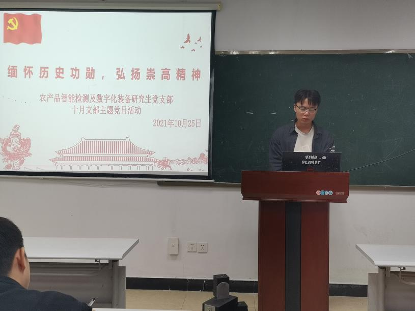 农产品智能检测及数字化装备研究生党支部组织召开十月主题党日活动。在领学习近平总书记在纪念辛亥革命110周年大会上的重要讲话精神时,刘瑜明同志谈到,辛亥革命是近代中国比较完全意义上的民族民主革命,传播了民主共和理念,极大推动了中华民族思想解放,以巨大的震撼力和影响力推动了中国社会变革。我们作为新时代的研究生党员,要担当时代责任,努力学习成长,为成为合格的新时代社会主义建设者和接班人而努力奋斗。黄开虎同志从为什么建设人才强国?什么是人才强国?怎样建设人才强国?三个角度领学习近平总书记在中央人才工作会议上的重要讲话精神。他谈到,党的十八大以来,党中央作出人才是实现民族振兴、赢得国际竞争主动的战略资源的重大判断,作出全方位培养、引进、使用人才的重大部署,推动新时代人才工作取得历史性成就、发生历史性变革。何昱廷同志分享到,站在“两个一百年”的历史交汇点上,我们要贯彻学习习近平总书记重要讲话精神,继承发扬光荣传统,牢记历史、锐意创新,坚定不移听党话、矢志不渝跟党走。