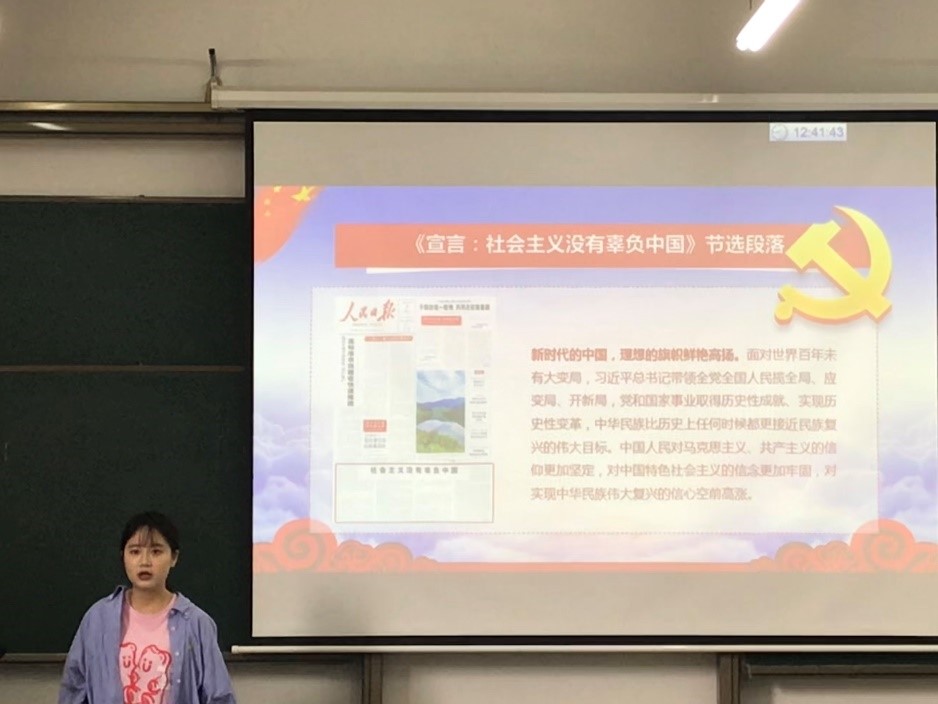 会议开始,邹周同志领学了新文化运动和五四运动两大历史事件。通过学习,支部党员感受到在那个风云变幻的时代,先进知识分子的爱国精神和破旧创新精神到了今天仍然值得我们学习。丁羽喆同志则带领大家学习了《宣言:社会主义没有辜负中国》。