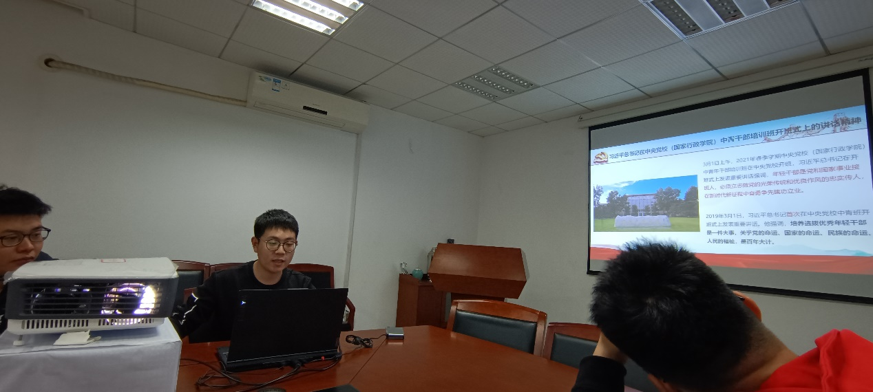 )中青干部培训班开班式上的讲话精神,他提到习近平新时代中国特色社会主义思想是马克思主义中国化的最新成果,集中体现了马克思主义的理论品格和精神实质,闪耀着马克思主义的真理光辉,是当今时代最现实、最鲜活的马克思主义,作为研究生党员,我们应该积极响应并认真学习。祝浩东同时还向支部成员介绍了《华中农业大学庆祝中国共产党成立100周年活动实施方案》以及《华中农业大学党史学习教育实施方案》,祝浩东同志认为学校丰富多彩的党史学习活动为我们进一步学习党史提供了一个大的平台与契机。