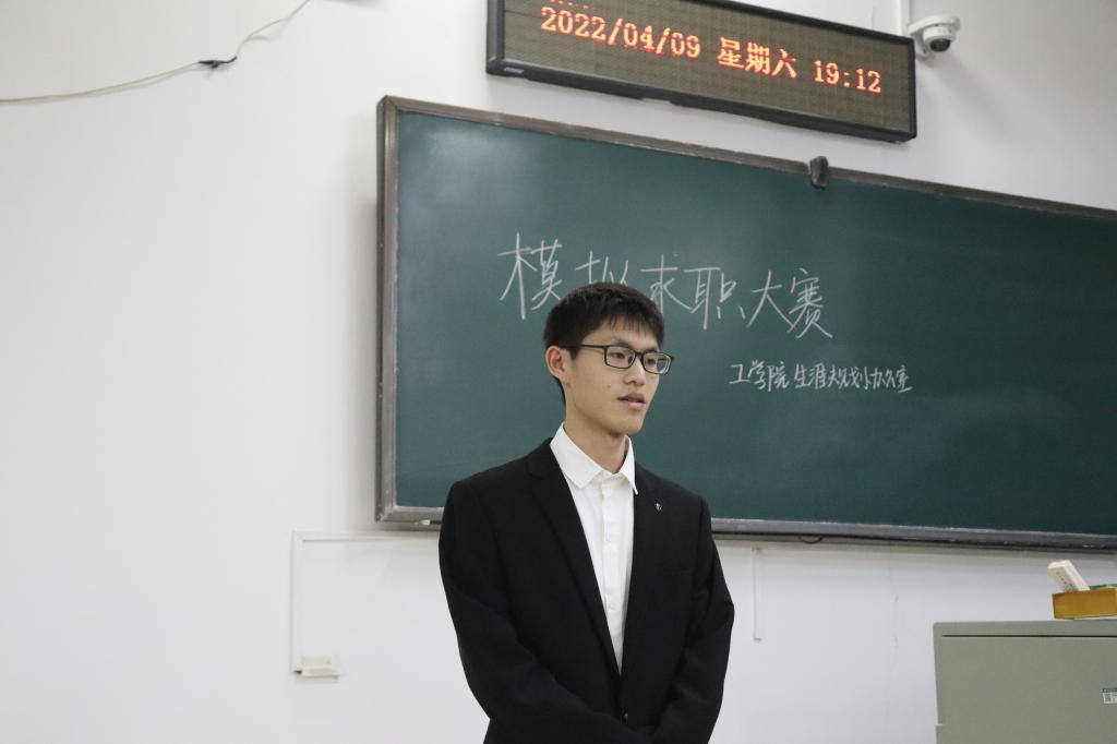 于4月9日晚在三教A101教室举办“挑战自我,勇往‘职’前”模拟求职大赛,党建办副主任牛彦东、学生会轮值主席黄巧及辅导员周熙老师、于斌老师担任比赛评委。
