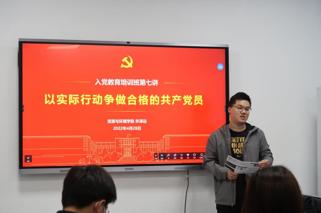 针对发展党员过程中的思想建设问题,通过列举华中农业大学王鲁峰教授及白威、杨海川等人的先进事迹,许泽远向各位同学讲述了正确入党动机的重要性与唯一性。他强调,必须树立完全正确的入党动机,只有树立了正确的入党动机,才能经受住党组织的考验,才能真正在思想上入党。对于党员标准的划分,许泽远表示,要自觉接受党组织的培养、教育与考察,及时学习先进思想与党的核心理念。同时,要以个人的实际行动入党,积极参与党组织的各类学习实践活动,自觉加强党性锻炼,在实践中成长,不断提升个人的思想政治水平。