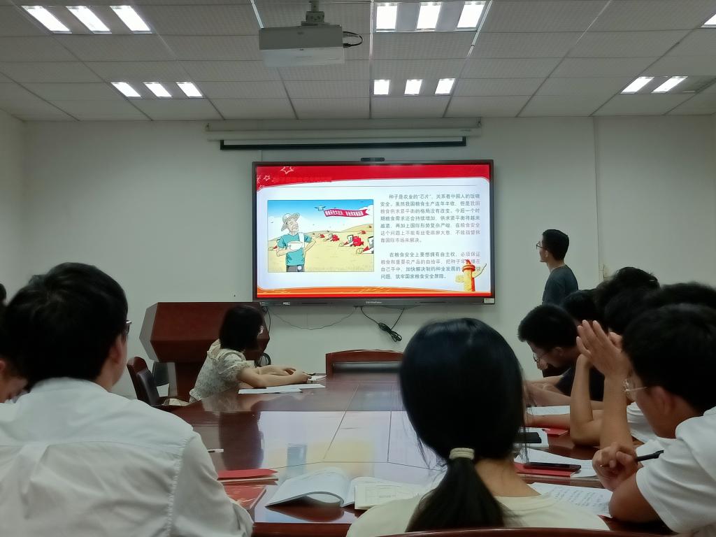 陈佃贞同志领学习近平总书记关于安全生产的重要论述和习近平总书记在海南省三亚市考察调研时的重要讲话精神。他强调我国粮食供求紧平衡的格局没有改变,必须保证粮食和重要农产品的自给率,把种子牢牢攥在自己手中。在领学安全生产时,陈佃贞同志提到我们要始终牢记安全发展的理念,常备忧患意识,强化安全意识,在实验过程中始终把安全放在第一位,遵守实验室的规章制度,从根本上杜绝实验室安全事故的发生。
