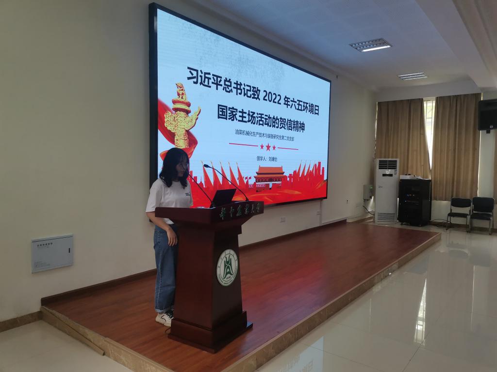 油菜机械化生产技术与装备研究生第二党支部书记刘靖怡在领学习近平总书记致2022年六五环境日国家主场活动的贺信精神时谈到,我们党员不仅要以身作则,保持勤俭节约、低碳环保的良好生活习惯,起到模范带头作用,更要号召其他同志从身边小事做起,如避免使用一次性碗筷、践行光盘行动、出行乘坐公共交通工具等,减少碳排放。同时她呼吁,我们要保护生态环境,坚持绿水青山就是金山银山的理念,共同参与生态文明建设和生态环境保护工作,努力建设人与自然和谐共生的美丽中国,为共建清洁美丽世界作出更大贡献。