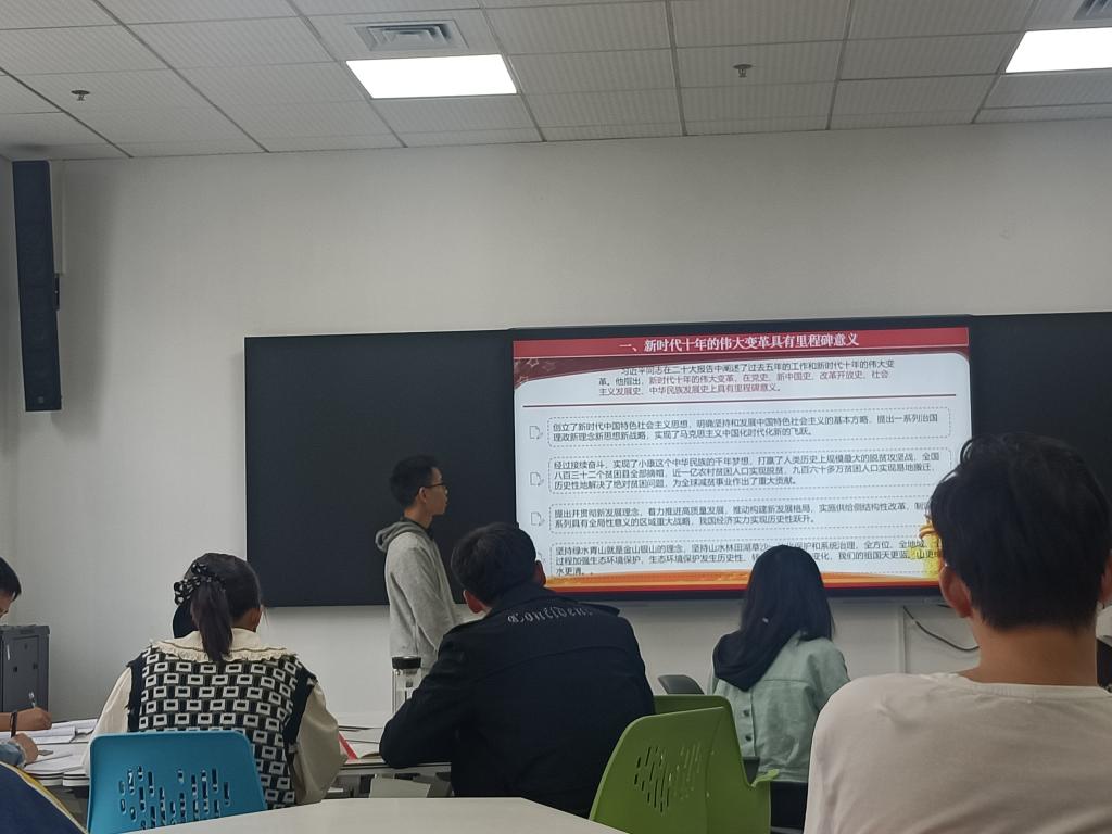 曾志勇同志领学二十大报告中“过去五年的工作和新时代十年的伟大变革”“开辟马克思主义中国化时代化新境界”“新时代新征程中国共产党的使命任务”“加快构建新发展格局,着力推动高质量发展”等内容。他分享到,以中国式现代化全面推进中华民族伟大复兴是我们党中心任务的重要内容,中国式现代化不仅需要党的领导,更需要全国各族人民的团结奋斗。助力高质量发展,我们研究生党员能做的首要任务就是提升科技创新能力。