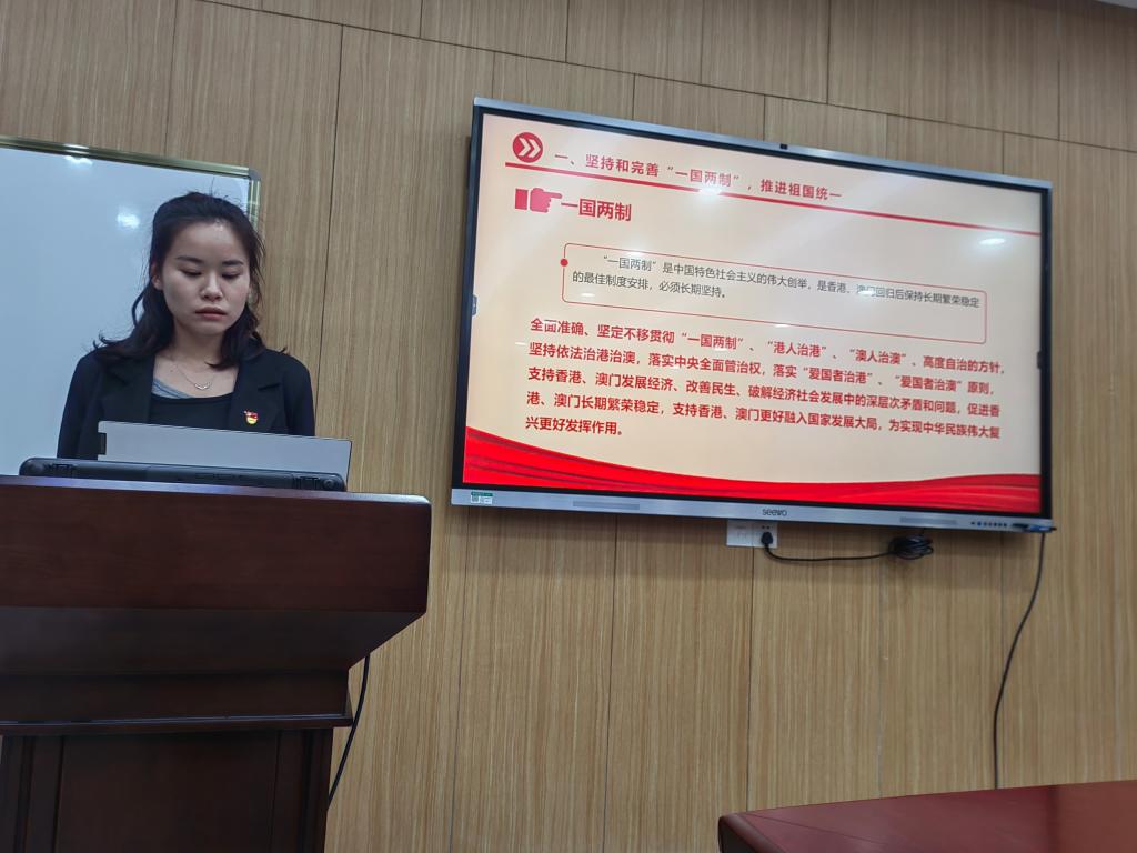 乔玉慧同志领学“坚持和完善一国两制,推进祖国统一”相关内容时谈到,“一国两制”是中国特色社会主义的伟大创举,是香港、澳门回归后保持长期繁荣稳定的最佳制度安排,必须长期坚持。当前,国家统一、民族复兴的历史车轮滚滚向前,祖国统一一定要实现,也一定能够实现!
