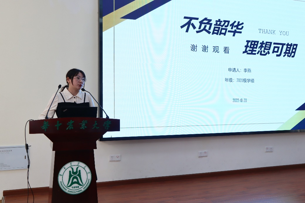 2022年研究生国家奖学金评审公开答辩会在工程楼A111报告厅举行。院党委副书记瞿明丽、导师代表宗望远教授、牛智有教授、晏水平教授、周勇副教授、杨方副教授、林卫国副教授参加评选会。12名研究生依次登台,讲述科研与奋斗的故事,展现追求卓越的风采。会议由院党委副书记瞿明丽主持。
