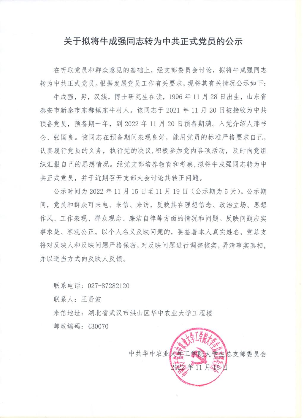 【研】关于拟将牛成强同志转为中共正式党员的公示