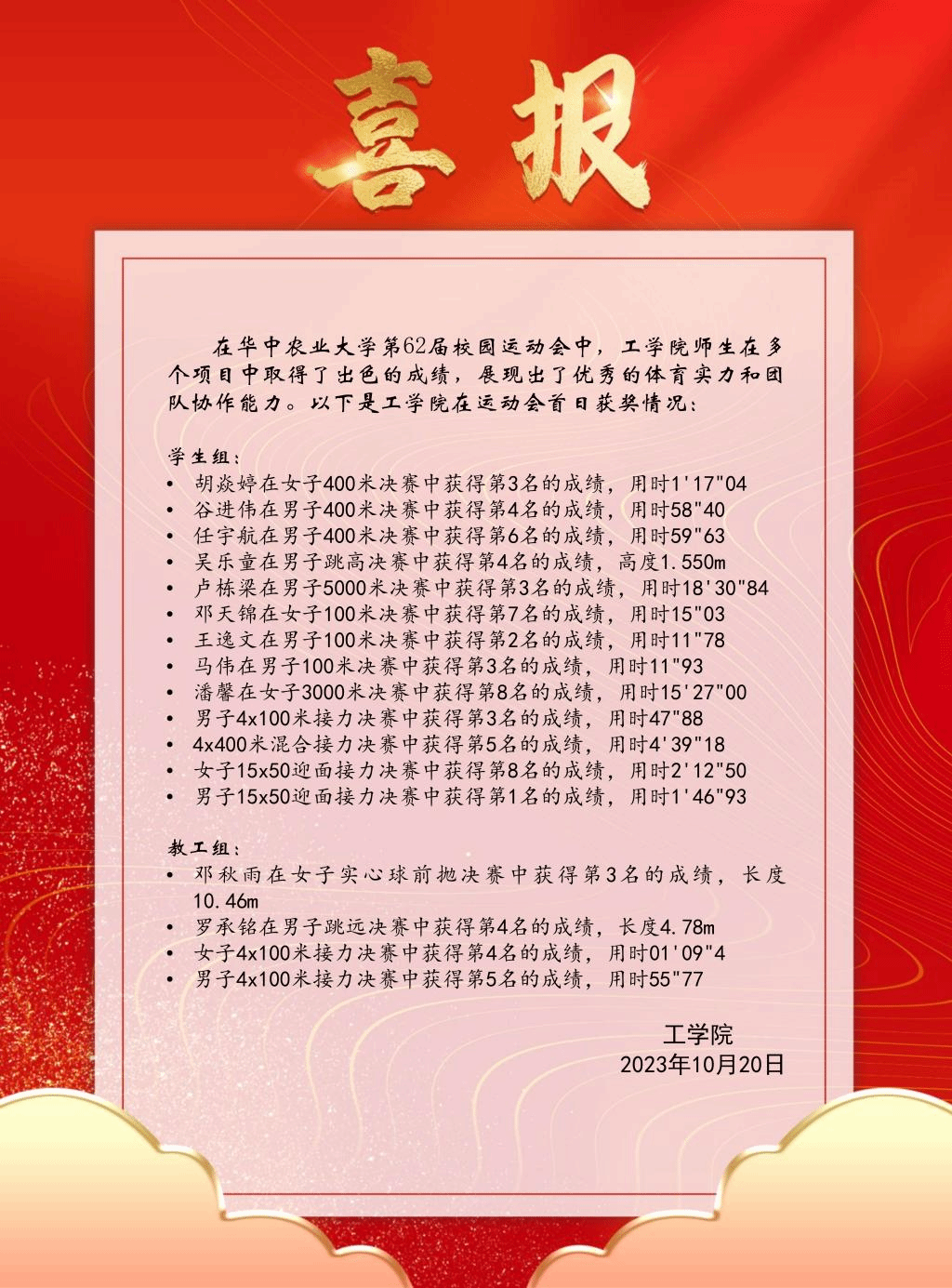 运动会首日工学运动员们的佳绩吧!