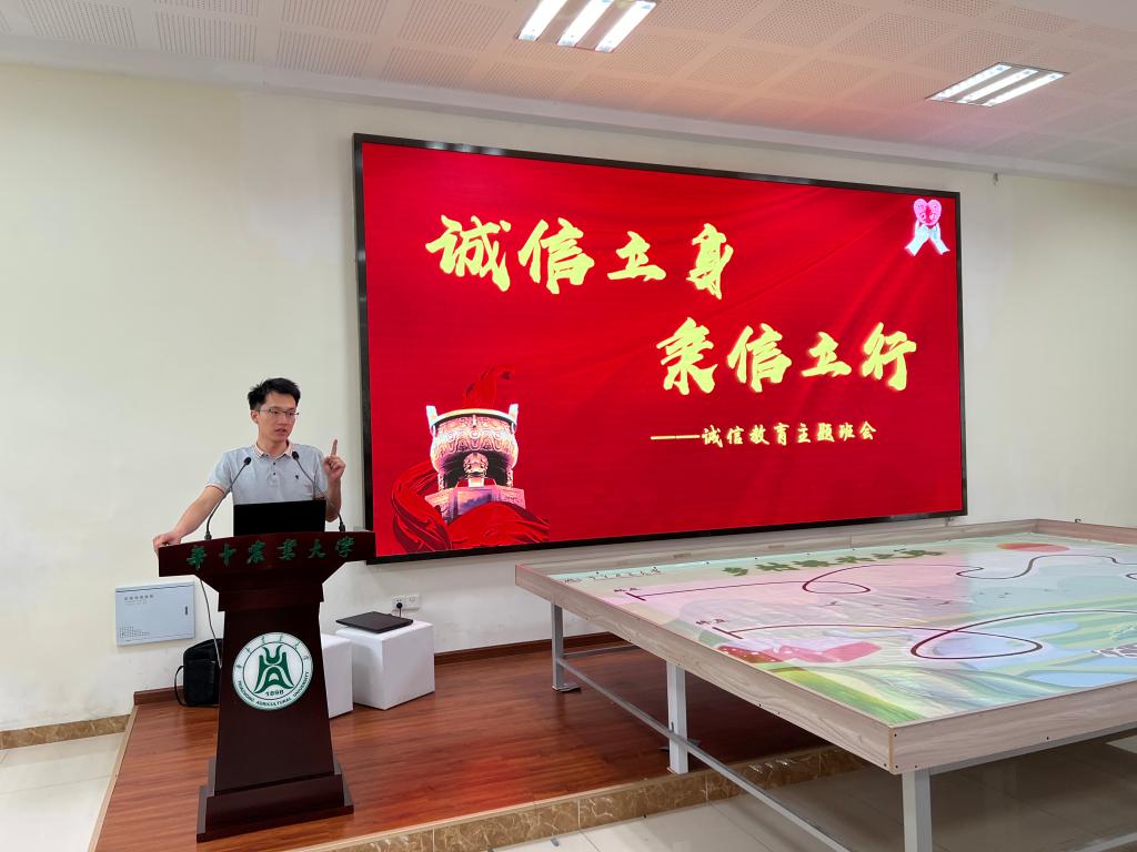 特别邀请了辅导员王凤武老师向学生们解读了诚信的内涵和价值,并结合生动的案例进行讲解。王老师说“拥有诚信,脚下可踏一方净土;坚守诚信,必有问心无愧的归宿;敬仰诚信,夯筑人生的铁壁铜墙;播种诚信,收获信任的海洋。”令同学们感慨良多。许多同学都积极的分享了自己的经历和感想。