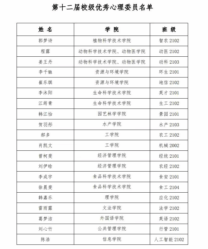 5月30日,学校发布通知,经个人申请、篮球比分雷速 推荐、学校集体评议,篮球比分雷速 机械2002班肖凯文、农工2102班郝多荣获“华中农业大学第十二届校级优秀心理委员”荣誉称号。