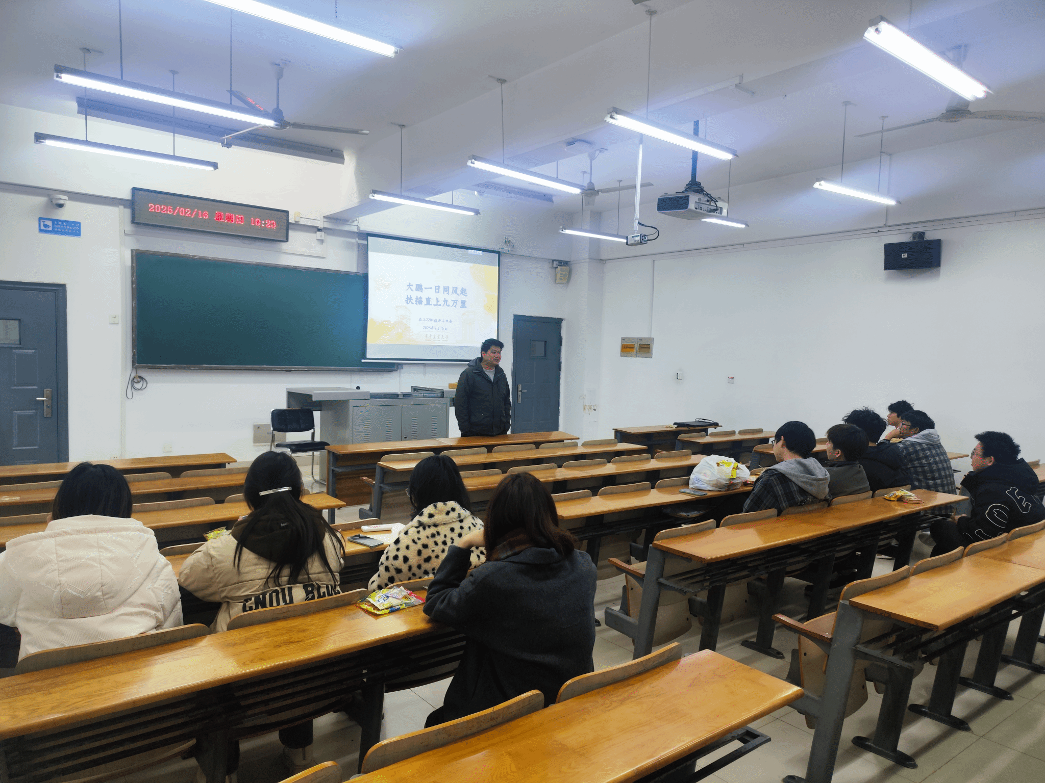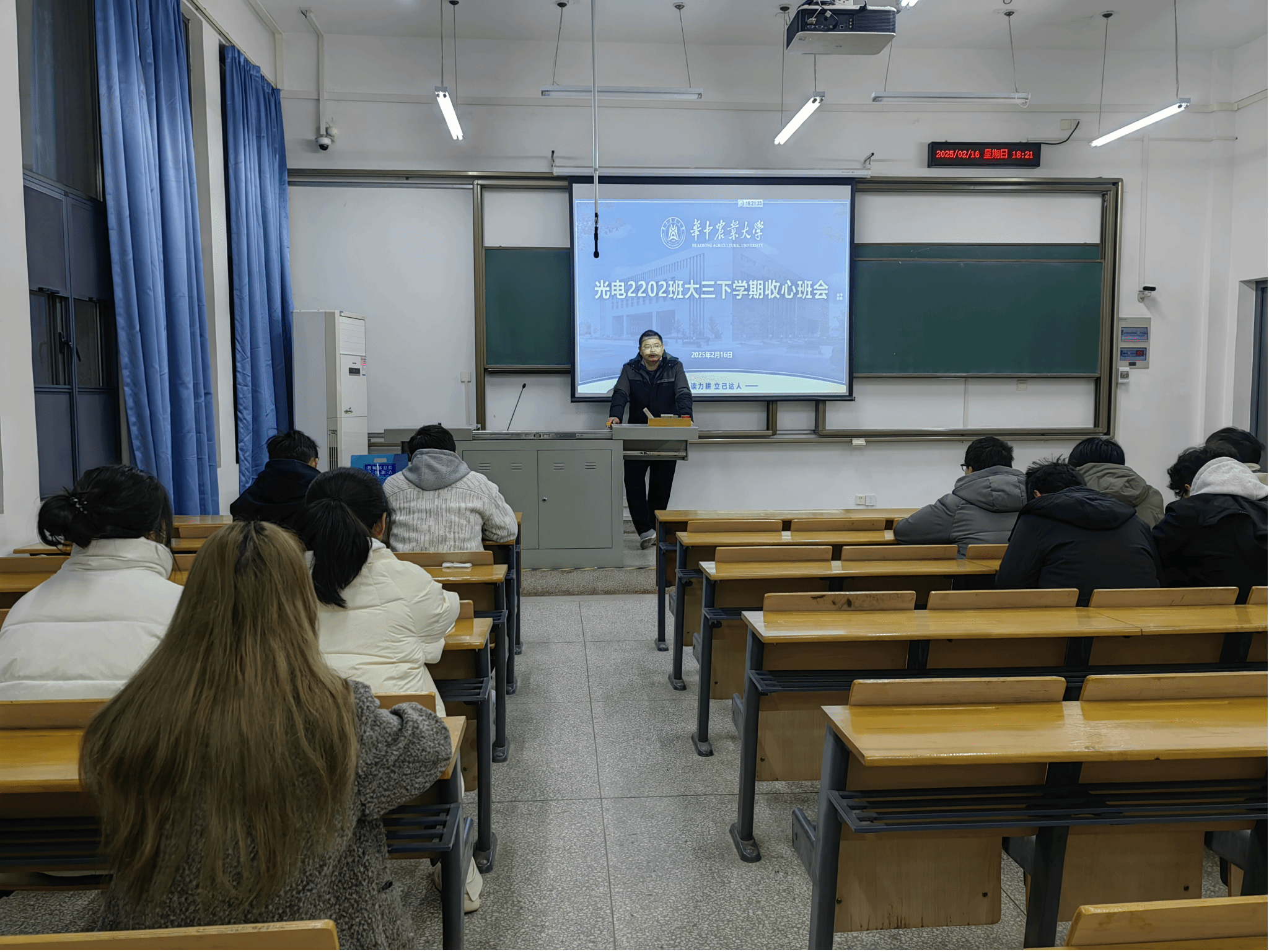 在光电2202的班会上,班主任陈建军老师组织同学们积极分享寒假生活,同学们围绕家乡变化、民俗文化、亲情感悟等内容畅所欲言。陈老师着重开展了学情分析及考研动员,“每个宏伟的目标都源自微小的开始,要提前确定考研目标院校,并制定详尽计划并付诸实践。” 最后,他期望同学们自立自强,不断强化自律意识,过好大学生活的每一天。