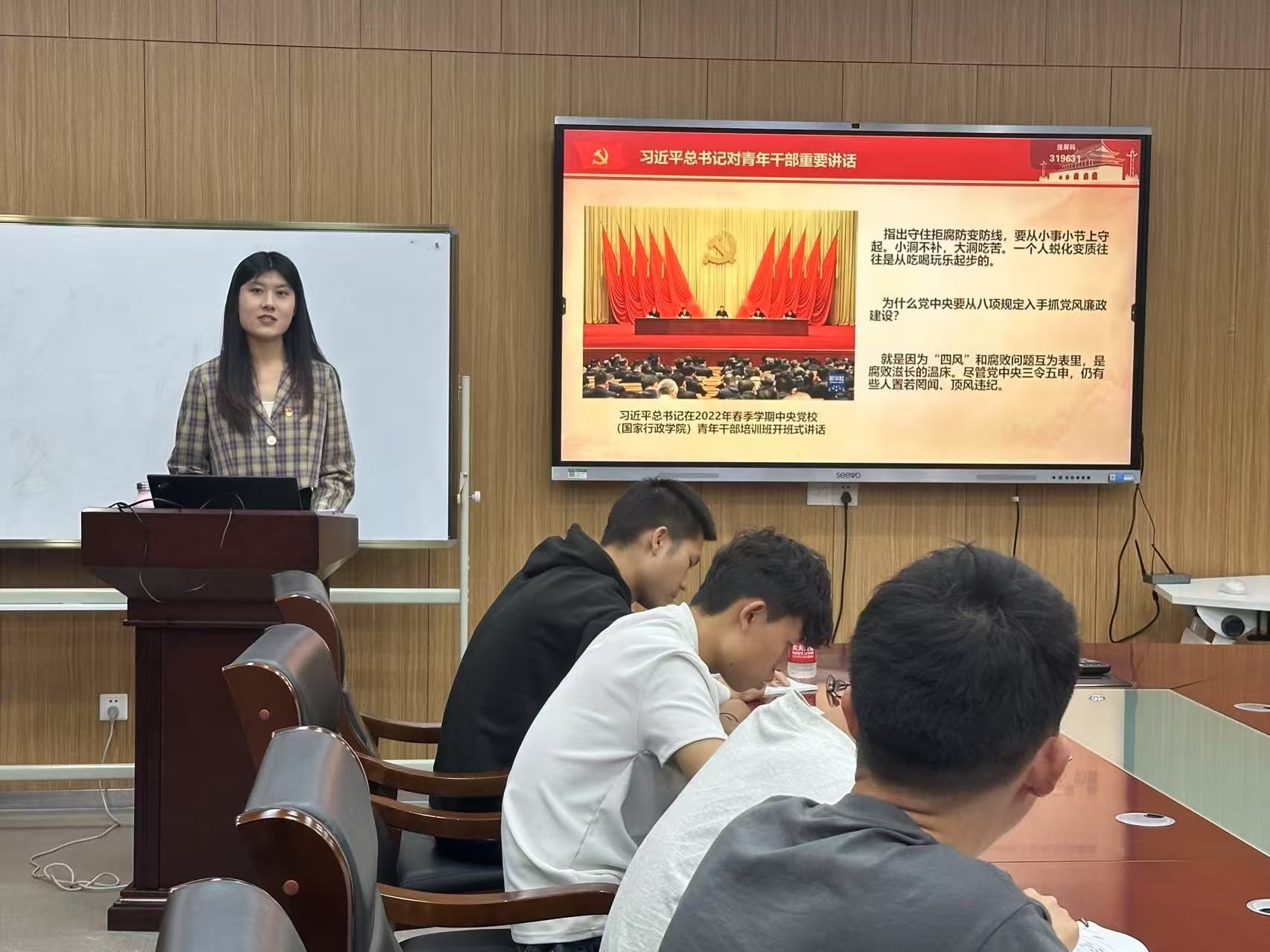 2024级硕士研究生张乐就中央八项规定精神进行了领学。张乐以“历史之镜照现实”为切入点,沿循三湾改编“三大纪律八项注意”雏形诞生、古田会议作风奠基,至新时代中央八项规定出台及深化历程的时间脉络,深入浅出阐释中央八项规定从历史根脉到时代枝叶的演进,让党员们明晰纪律建设一脉相承又与时俱进的深刻内涵,为后续学习筑牢理论根基。
