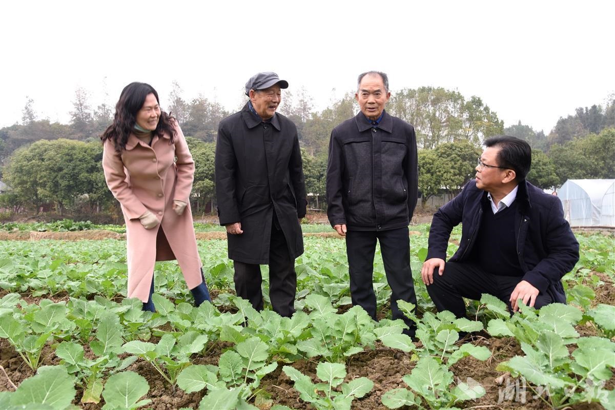 12月16日,崇阳县白霓镇古堰湾。生态农庄一隅,两位老人正在细看冬闲田油菜。