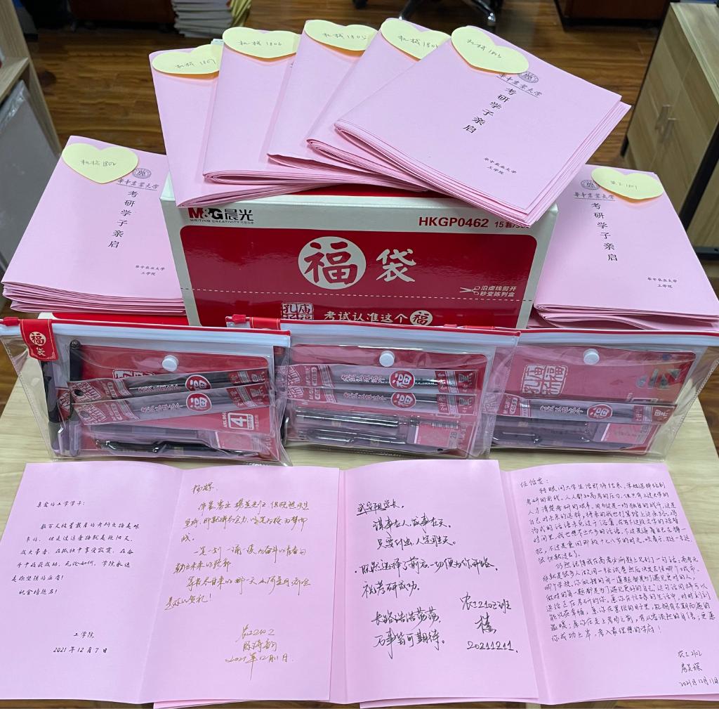 统一为300余名考研学子购买考研文具“福袋”,其中包含签字笔和笔芯各两支、涂卡笔一支、橡皮一块、尺子一套,保证学生考试工具不遗漏。