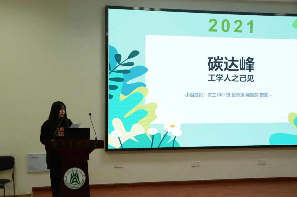 “碳达峰的道路上困难诸多,未来任重而道远,身为新时代新青年的我们义不容辞。”机械2002班高源说道,他利用图表、大数据等形式,生动直观地向在场同学们阐述了他对碳达峰的理解。农工2005班黄奕爽围绕“立足国情,了解局势”“扬长避短,不畏困难”“抓住机遇,迎接挑战”“翻山越岭,柳暗花明”等四个方面向同学们展示了控制碳排放的重要意义以及中国在节能减排方面为世界做出的突出贡献。农工2001班张承从“学好专业知识,提升自我技能”“树立环保意识,积极减少碳排”“确立发展方向,实现自我价值”等三个方面阐述了工学人对于减少“碳排放”的思考,呼吁大家为实现“双碳”目标做出自己的努力。
