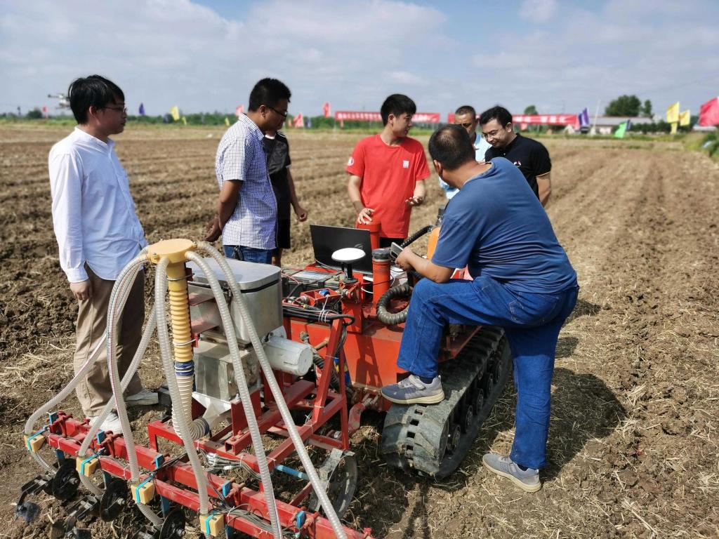 的几名研究生手拿键盘,操作一台大型无人油菜直播机,走线平直、速度均衡,易转弯、效率高,令在场的乡亲们齐声叫好。
