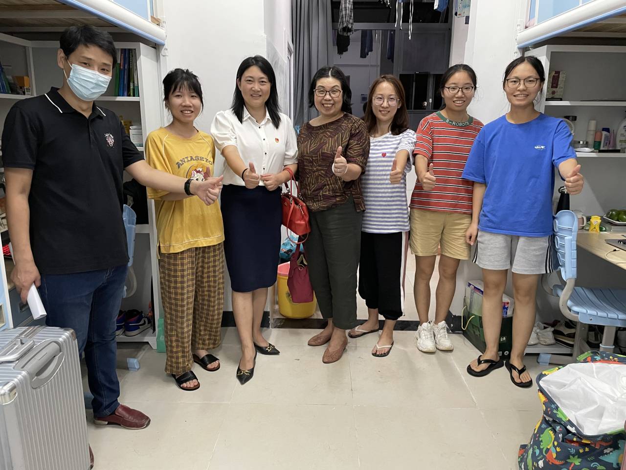 党委副书记瞿明丽和导师代表袁巧霞教授、晏水平教授挨个走进新生宿舍,询问同学们是否收拾好行李安顿下来,是否遇到困难,是否适应校园生活。老师们不仅关注到宿舍储物空间、床垫厚度等生活方面的小事,还鼓励新同学们营造良好的宿舍环境和氛围,积极锻炼,为接下来的学术生活提供坚实的基础。在走访过程中,老师们发现624宿舍的四个同学本科也是一个宿舍。瞿明丽在感叹她们的缘分之余,还赞扬了她们团结友爱的精神和为共同目标而努力的决心和毅力,希望她们能够将这样美好的品格继续保持下去。“来,同学们,我们一起拍个合影吧。”在与同学们深入交流后,瞿明丽提议导师代表与新生进行了合影留念。