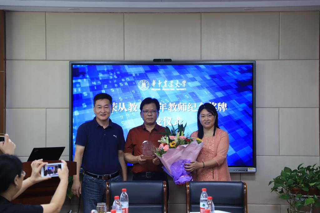院党委书记明庭庆、副书记瞿明丽为从教三十年教师廖庆喜颁发纪念奖牌和鲜花