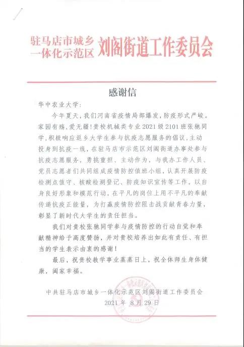 学校即将开学,张驰也即将迎来自己在华中农业大学的四年学习生活。驻马店市城乡一体化示范区刘阁街道工作委员会给学校寄来了感谢信,对张驰参与疫情防控的行动自觉和奉献精神给予高度肯定。或许,这是张驰开启大学生活的前奏曲,相信,未来四年,张驰一定能够在大学用他的担当精神和奉献精神,谱写出他对“与祖国同行,为人民奉献”的青春乐章!