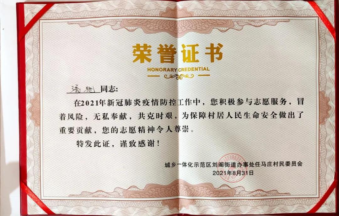一个月的抗疫志愿服务结束时,因为表现突出,张驰收到了村委会的表彰。他说“在风雨中坚守后,我们一起等来了晴天!千家万户的安宁真的来之不易,守护这份安宁的其实就是我们每个人。”他还表示,这次社会实践,丰富了自己的人生经历,锻炼了自己的工作能力,更让自己体会到了个人价值与集体意义是能够深度融合的,学生身份与社会身份是能够深度融合的。