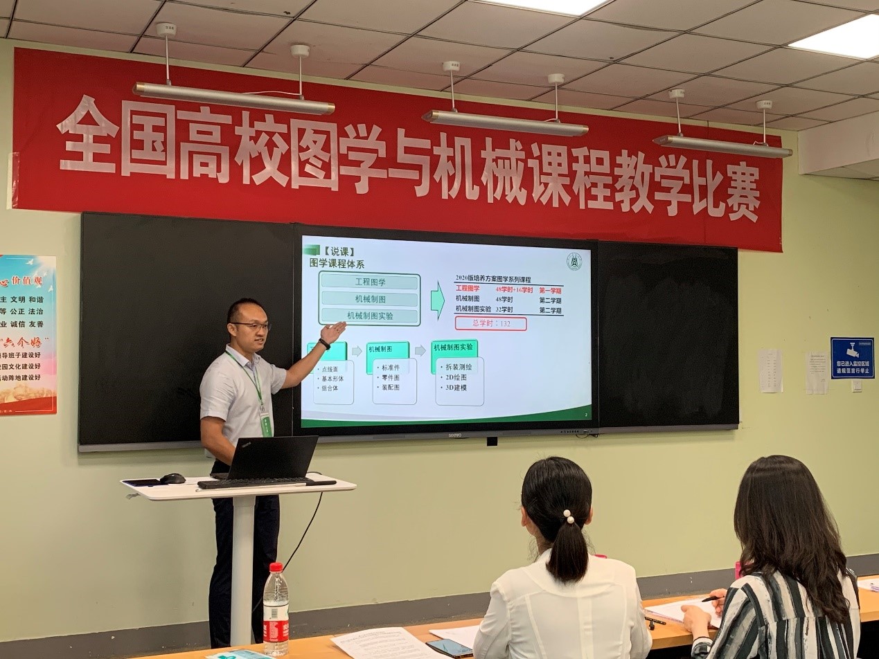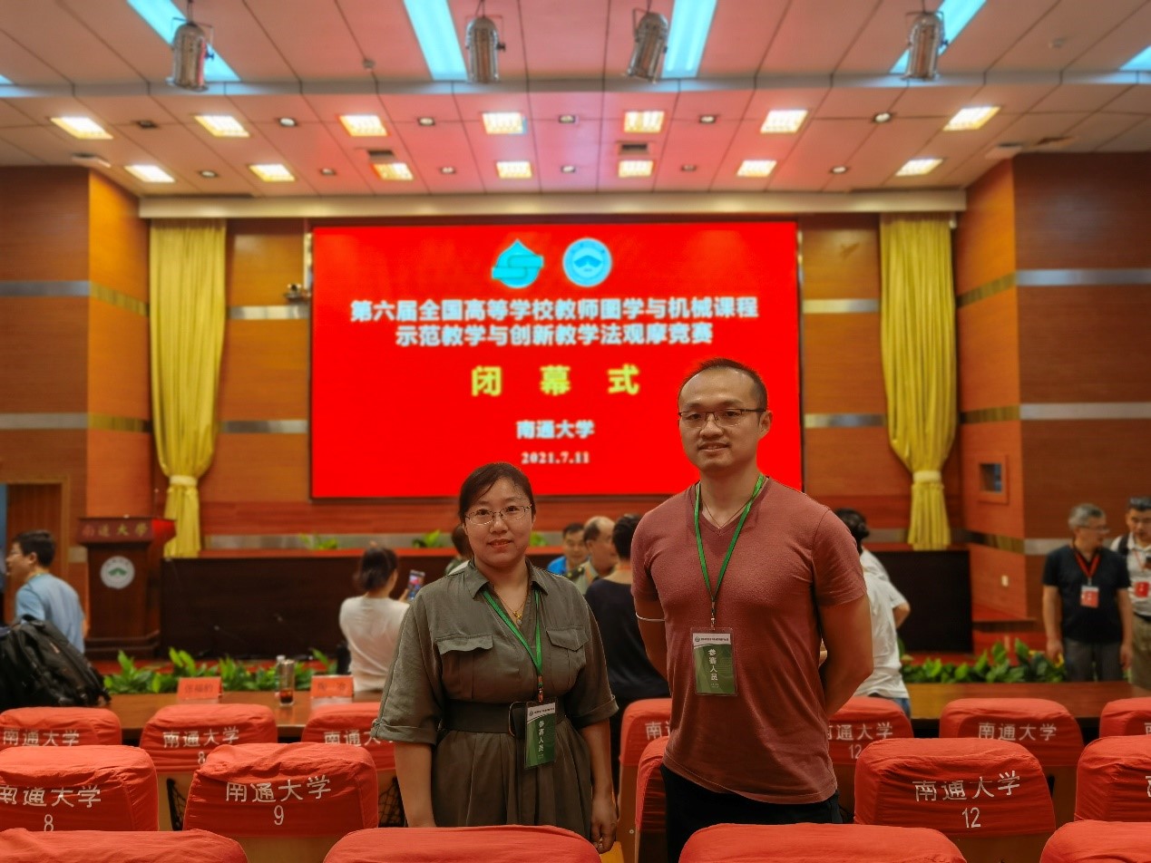 本次比赛分为说课和讲课两个环节,现场抽签决定讲课内容,杜俊老师在说课环节中阐述了“以学生为中心、以教学效果为导向、开展科教融合”的教学理念,在讲课环节中以科研项目中的农情监测机器人案例作为引入,讲授了《叠加型组合体的画法》。最终凭借充实的教学内容、新颖的教学方法、创新的多媒体手段及前沿的学科知识,获得了评委的肯定,荣获全国一等奖。本次比赛中,杜俊和王双双老师还积极观摩了其他选手的比赛,对教学设计、教学方法和教学理念的认识进一步提高,他们表示将把比赛中的收获和感悟带入日常教学,真正做到以赛促教。