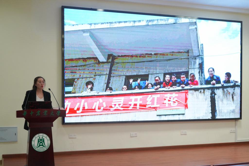 2017级机电专业的胡世灵同学介绍了华中农业大学研究生支教团的起源和发展,向大家说明支教团的相关工作内容和招募政策,并介绍了安钥琦等优秀支教团志愿者代表,呼吁更多有志愿服务志向的本科生参加研究生支教保研项目。