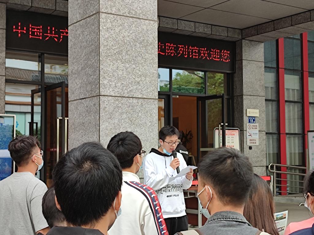 在中国共产党纪律建设历史陈列馆门前广场,2019级硕士刘国阳同志讲述了中央监察委员会首届委员们的忠诚与担当。“中共五大选举产生了我们党历史上第一个纪律检查机构——中央监察委员会,相当于中央纪委的前身。首任主席王荷波在被叛徒出卖被捕后,受尽严刑拷打,但始终坚贞不屈严守党的秘密。其余9名委员在生死抉择的考验前无一人叛党,用生命诠释了何谓忠诚。”