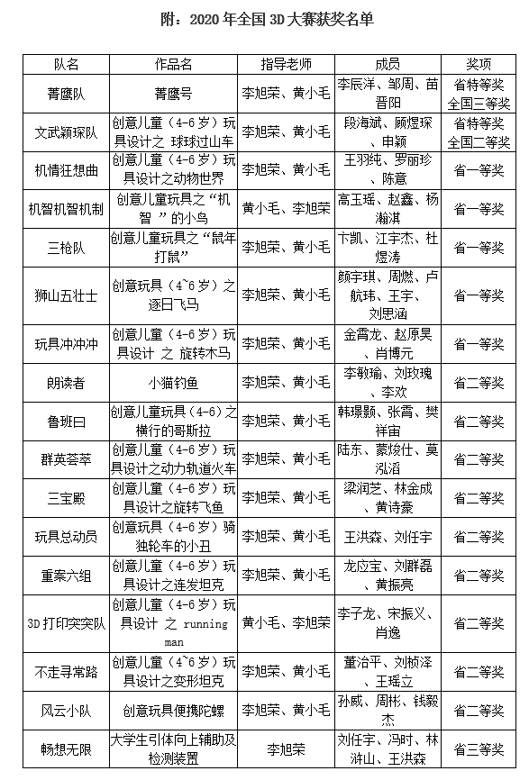 举办了华农第三届3D设计与打印能力大赛,并从校级获奖作品中向全国3D大赛预赛/省赛推送了21件作品。在2020年11月份公布省赛结果中,我校获得特等奖2项、一等奖5项和二等奖9项,三等奖1项,并获得国赛入围资格2项。通过比赛,同学们的实践、创新能力得到全方位锻炼,不仅调动了学习专业知识和技能的积极性,还弘扬了以“工匠精神”为核心的制造强国梦想。