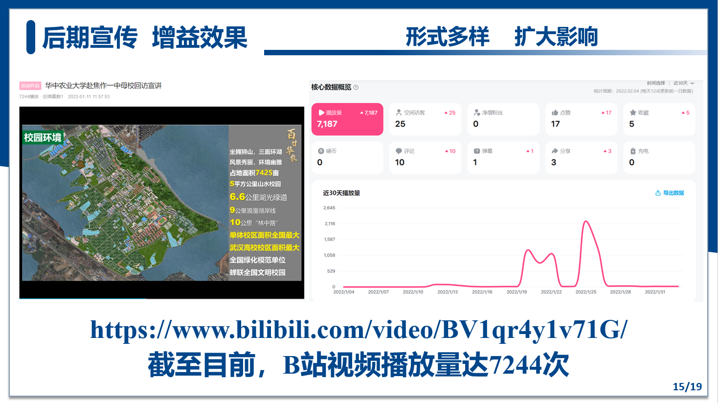2021级任育昕组成,李辰洋担任队长。在华农学习生活近4年的李辰洋全方位、系统性介绍华农的综合情况,包括办学历史、校园环境、办学规模、综合排名、科技实力、培养理念、校园文化、招生政策、报考指南、问题答疑等方面。他谈到:“华农的人才培养体系非常棒,为我提供了许许多多科学研究、学生工作、志愿服务的平台,使我最终能够直博天津大学。”通过他的介绍,让一中学子对华农的育人体系有了更深入的理解。在后期宣传方面,团队成员自制视频,并将宣传视频发布至B站,视频播放量达7244次,同时将宣传内容发布QQ空间,热度突破2.6万,获7269个点赞。