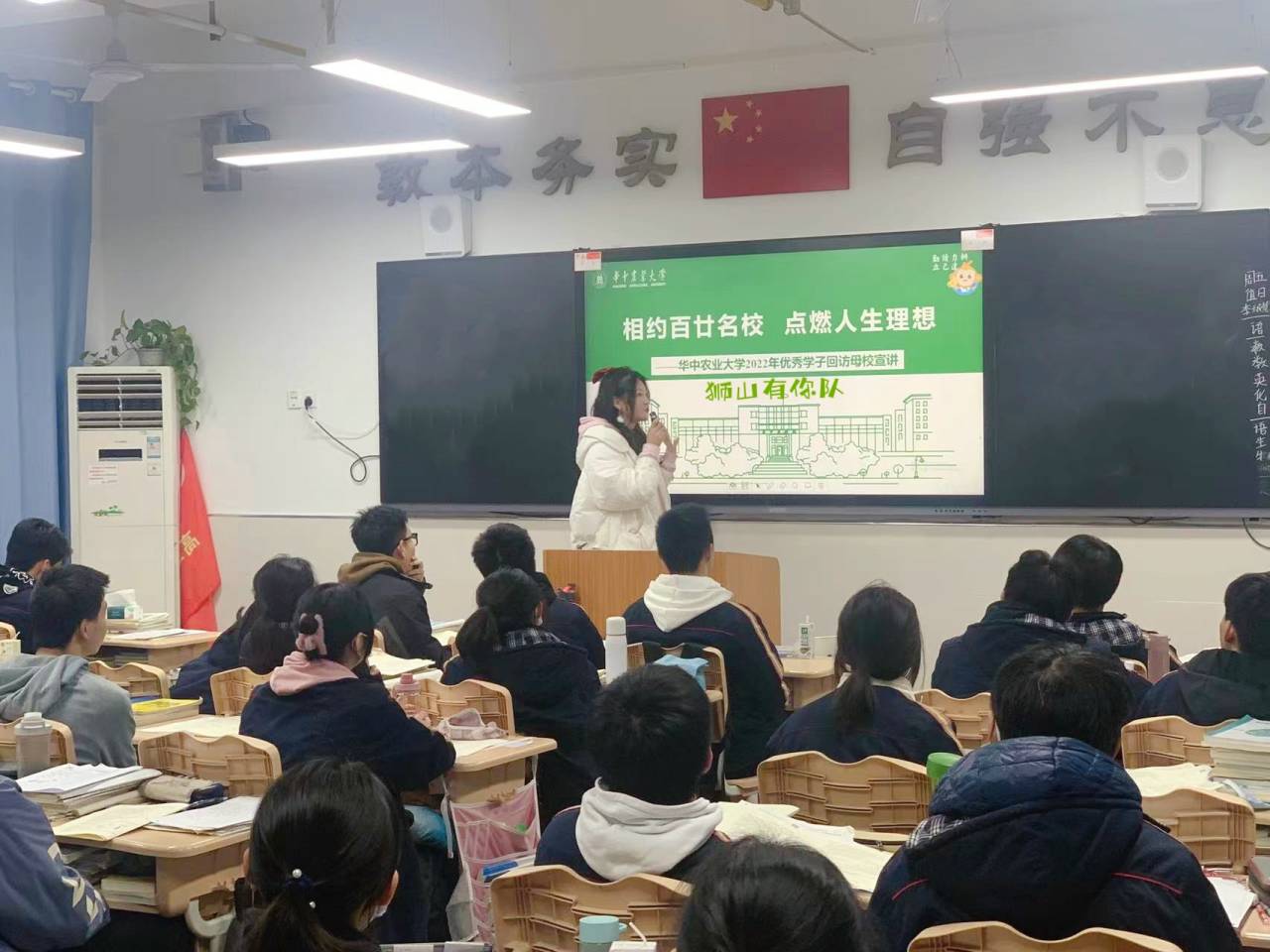 园林2104班邓煜丰组成,由雷文芊担任队长。该团队进入武汉市晴川高级中学进行了线下宣讲,也是全国第一支进入该校进行宣讲的大学生团队。该团队先后在四个班级,面向240多位高中学子进行了宣讲,深得老师和同学们的认可。宣讲后,一名晴川高级中学的学生谈到:“我一定要充分利用这不足200天的备考时间,提升成绩,争取考入美丽的华中农业大学。”随后,团队将回访母校的历程和感受以文字和照片形式记录下来,上传“小红书”,目前已累计观看10841次,获赞670个,并且将宣传过程制作成视频,受到社会各界的广泛关注。
