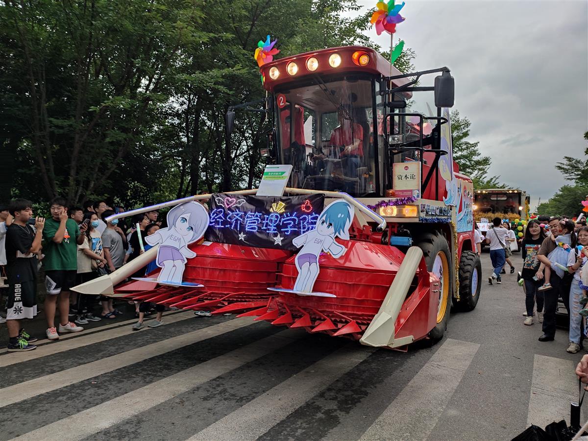 当天的巡游队伍,打头的是一辆无人驾驶拖拉机——头戴“博士帽”的“工小航”。随后,是“大黄蜂”、收割机、各式拖拉机、油菜割晒机……这些现代农机装备中,大多数是往年毕业巡游的“老朋友”,有的则是今年亮相的“新面孔”。夜色中,机车上装饰的彩灯纷纷亮起。