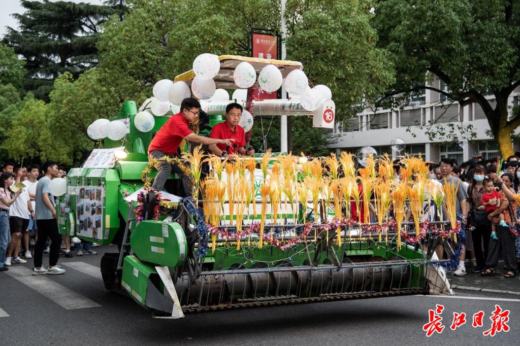 毕业巡游是华中农业大学的传统活动,自2019年启动以来,每年坚持举办。五颜六色的“钢铁巨无霸”经过学生们的精心装扮,被稻穗、鲜花、气球、彩灯包围,一改传统农机“傻大粗黑”的刻板印象,变得俏皮可爱。