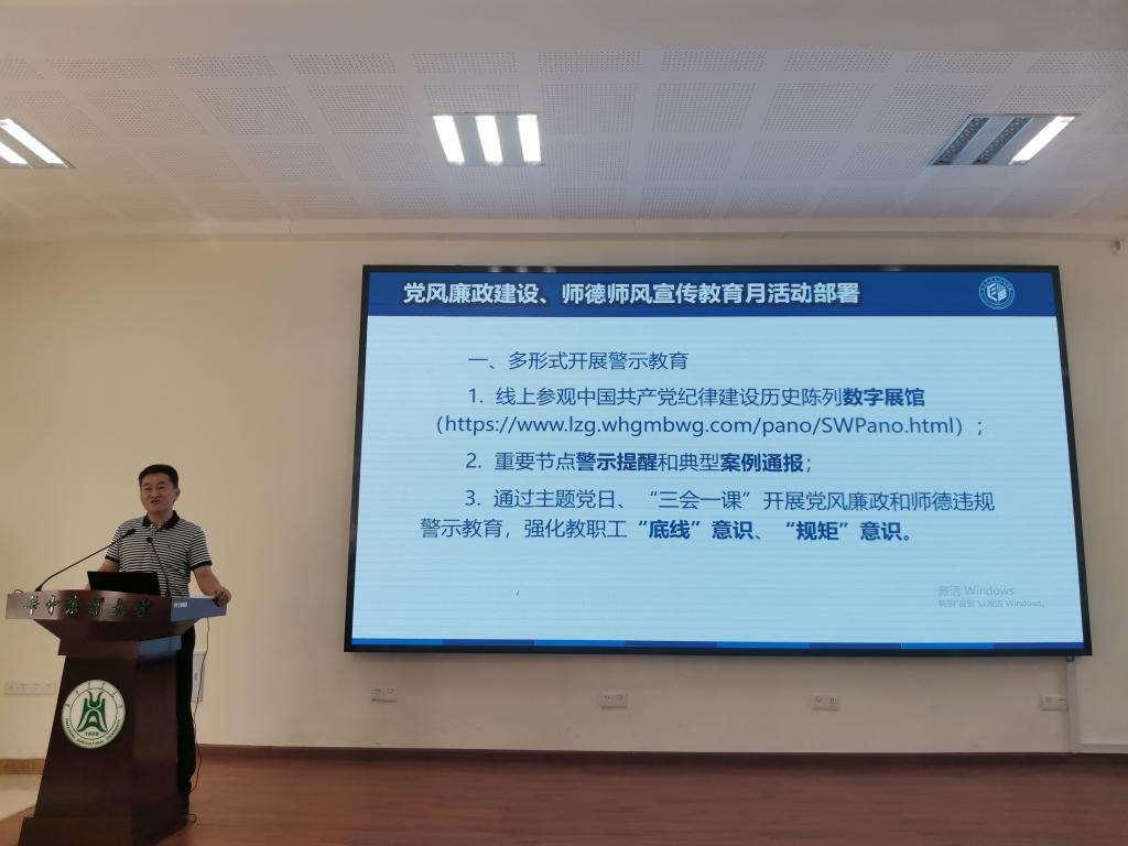 在工程楼A111报告厅举行党风廉政建设和师德师风建设宣传教育月部署会。党委书记明庭庆主持部署会,全体教职工参加此次会议。