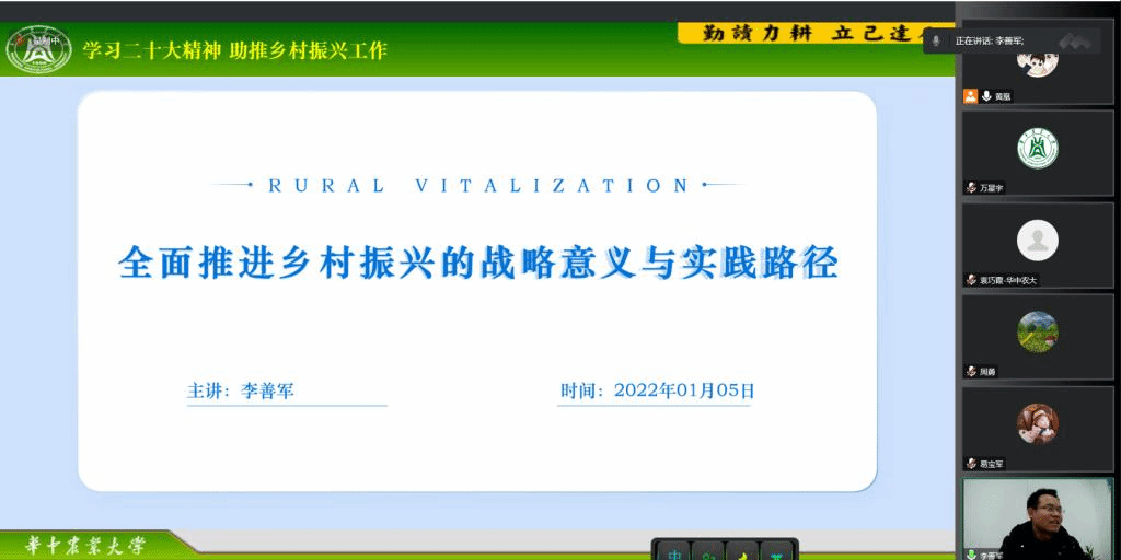 副院长李善军以“全面推进乡村振兴的战略意义与实践路径”为题进行了主题宣讲。他从我国“三农”发展情况、历年中央一号文件、《关于做好2022年全面推进乡村振兴重点工作的意见》、二十大报告等内容阐述了乡村振兴战略的提出背景及其重要意义。在讲述实施乡村振兴战略的总体要求时,乡村振兴要做到产业兴旺、生态宜居、乡风文明、治理有效、生活富裕,他强调“乡村振兴不是单打一,而是统筹谋划农村经济建设、政治建设、文化建设、社会建设、生态文明建设和党的建设,使乡村各方面建设全面推进、协调发展”。他从“坚持党管‘三农’原则,强化乡村振兴组织保障”“巩固脱贫攻坚成果有效衔接乡村振兴”“坚持绿色发展理念,建设生态宜居新家园”“以富裕农民为目标,培育乡村发展新动能”等四个方面讲述了湖北省三农问题现状及乡村振兴路径选择。最后,李善军强调:乡村振兴是一个历史课题,不是“轻轻松松,敲锣打鼓”就能实现的,必须拿出“功成不必在我”的精神境界和“功成必定有我”的历史担当,不驰于空想、不骛于虚声,驰而不息,久久为功,为乡村振兴做出应有贡献。