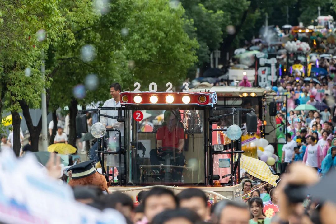 在师生们的欢呼中,校长李召虎老师登上巡游队伍头车,校党委书记高翅上前击掌互动。随着巡游队伍中随机选取的毕业生宣布巡游开始,引擎轰鸣、人声鼎沸,毕业巡游正式拉开序幕。
