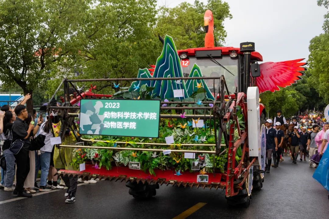 师生方阵格外惹人注目,9匹骏马由师生执缰骑行,彰显着动科动医学子“鲜衣怒马少年时”的蓬勃朝气,由我校自主研发的东方红割晒机车上,一只色彩鲜艳的火烈鸟振翅欲飞,以此祝福毕业生们永保内心的纯粹,坦途无畏、无惧风雨、追光逐梦!