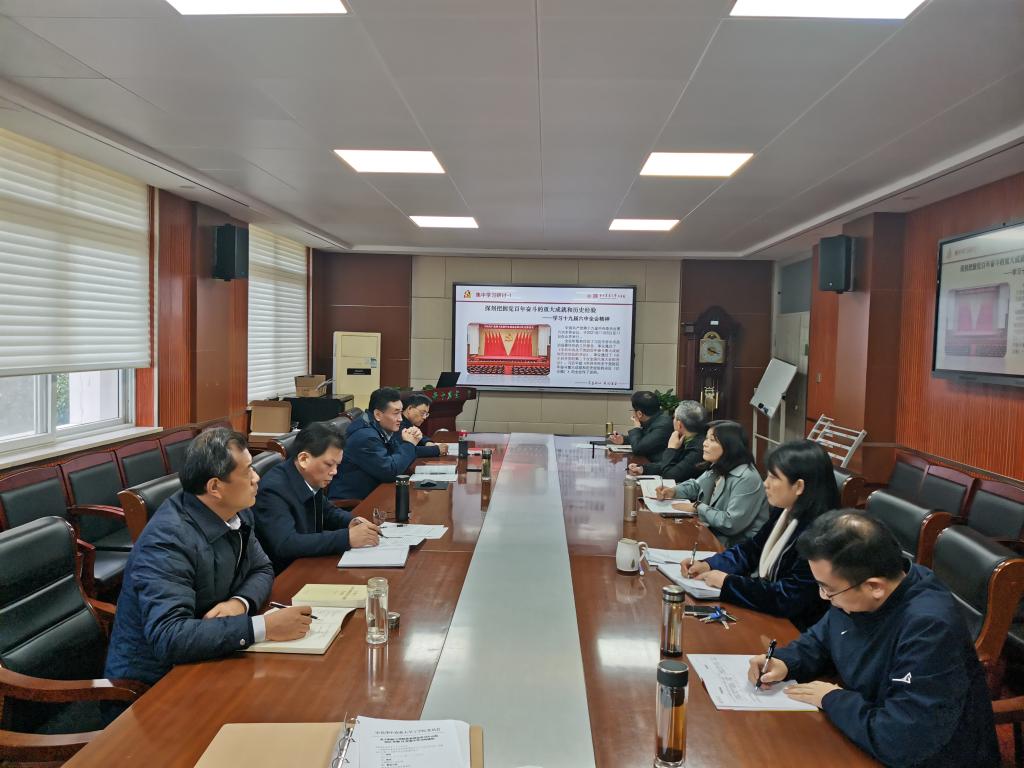 党委书记明庭庆带领与会人员学习十九届六中全会精神。他谈到十九届六中全会提出全党要坚持唯物史观和正确党史观,从党的百年奋斗中看清楚过去我们为什么能够成功、弄明白未来我们怎样才能继续成功,从而更加坚定、更加自觉地践行初心使命,在新时代更好坚持和发展中国特色社会主义。他认为党的百年奋斗历程经历四个“伟大飞跃”,这四个“伟大飞跃”的成就一脉相承,是中国共产党百年奋斗始终以“实现中华民族伟大复兴”为主题的辉煌成果,实现中华民族伟大复兴进入了不可逆转的历史进程。他谈到,习近平新时代中国特色社会主义思想是当代中国马克思主义、二十一世纪马克思主义,是中华文化和中国精神的时代精华,实现了马克思主义中国化新的飞跃。