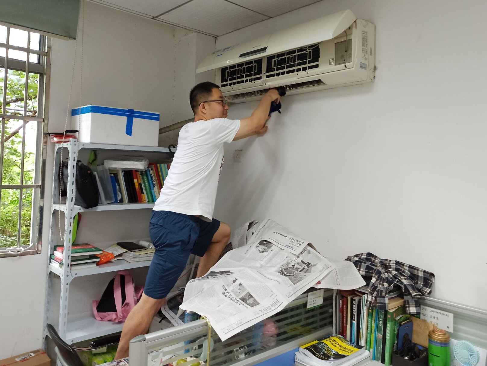 即将毕业留校工作的博士党员王磊正在清洗空调(乔佳郡 摄)