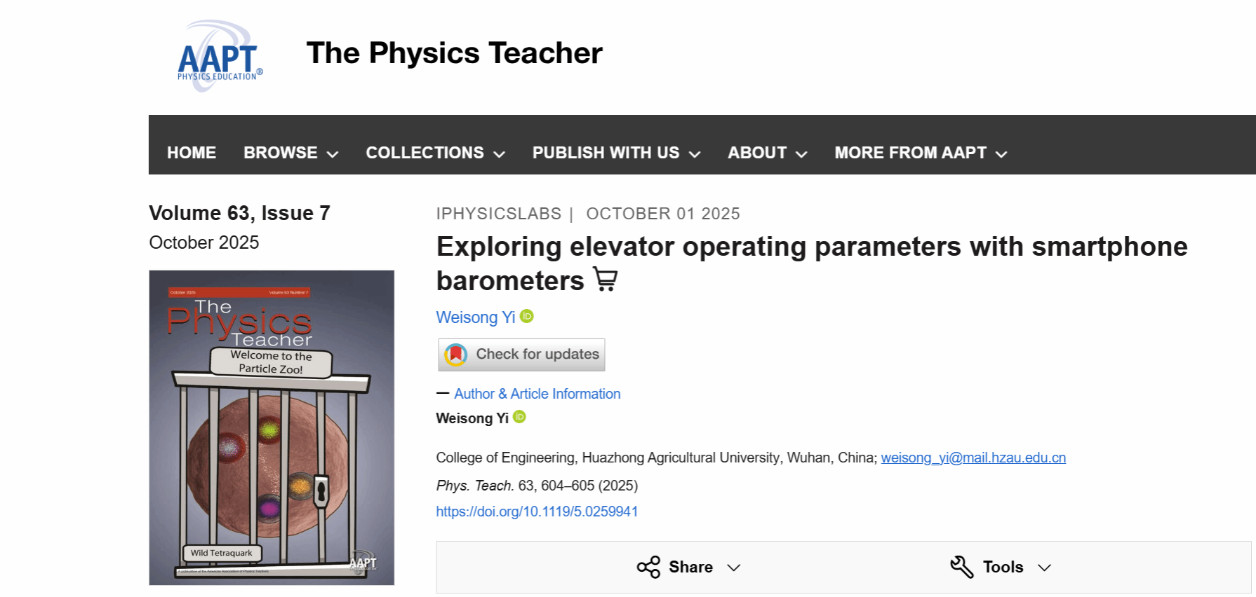 大学物理教学团队在《The Physics Teacher》发表了题为“Exploring elevator operating parameters with smartphone barometers”(Weisong Yi, 2025, Phys. Teach. 63, 604–605.)的物理实验教学研究论文。《The Physics Teacher》是由美国物理教师协会(The American Association of Physics Teachers,简称AAPT)主办的国际知名物理教育教学类期刊,为物理教育研究领域唯一的SCI收录期刊,具有非常高的学术影响力。