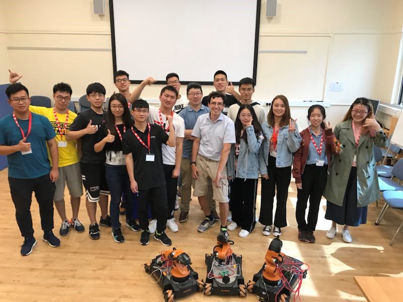 的Dr.Ze Ji向同学们讲述了ROS(Robot Operating System)平台、Kinematics分析和Python的基础知识,在其博士研究生Piatro的指导下,同学们学会了Linux系统的基本操作、模拟仿真和地图构建,并通过所学知识实现了对小型工业机器人KUKA的运动控制,课程取得了良好的效果,加深了同学们对机器人系统的认识和了解。