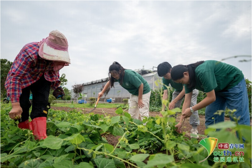 团队成员帮助农民一起打理菜地,亲自下地调研。中国青年网通讯员 程扬 摄